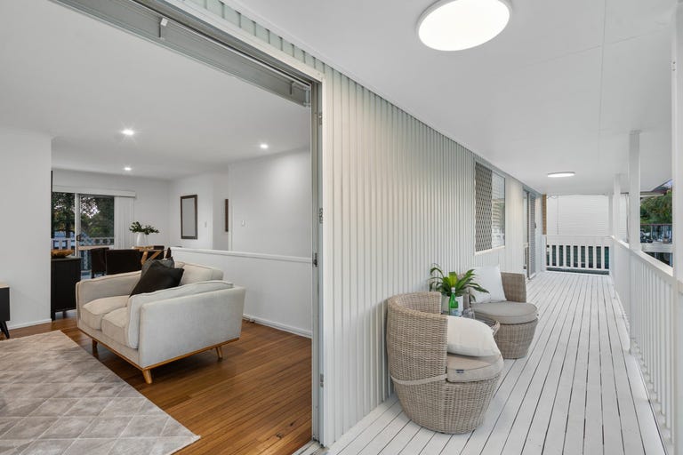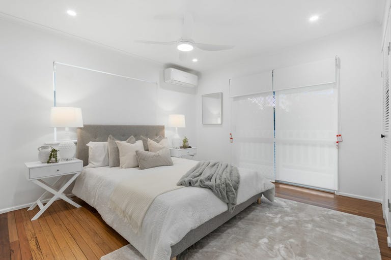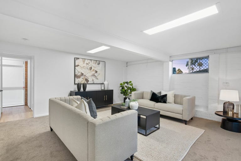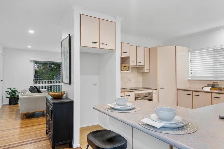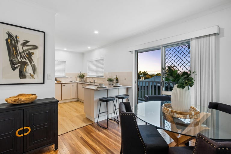 Upstairs, polished timber floors, glistening downlights, and air conditioning enhance the chic open-plan living, dining, and kitchen zone. Front and rear balconies provide breezy entertaining spaces and encourage cross-ventilation - perfect for relaxing afternoons or evening drinks accompanied by birdsong.