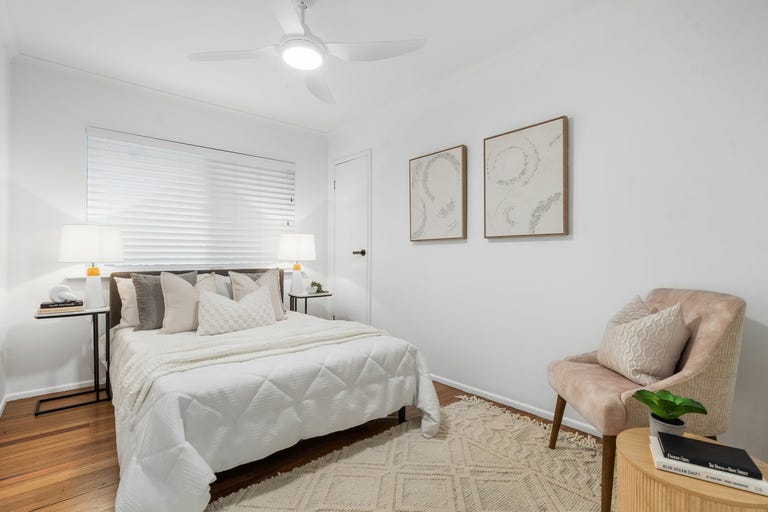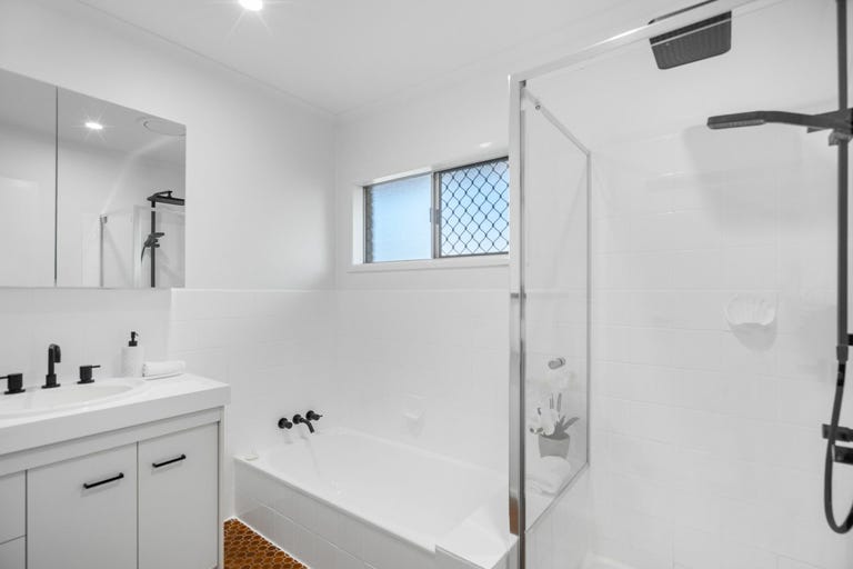 All three bedrooms are tucked away upstairs and feature elegant timber floors, built-in robes, and ceiling fans. The oversized master also includes an air conditioner, an extra cupboard, and access to the front balcony. A sleek, updated bathroom services them all, complete with matte-black tapware, rainfall shower, bathtub, and a separate water closet.